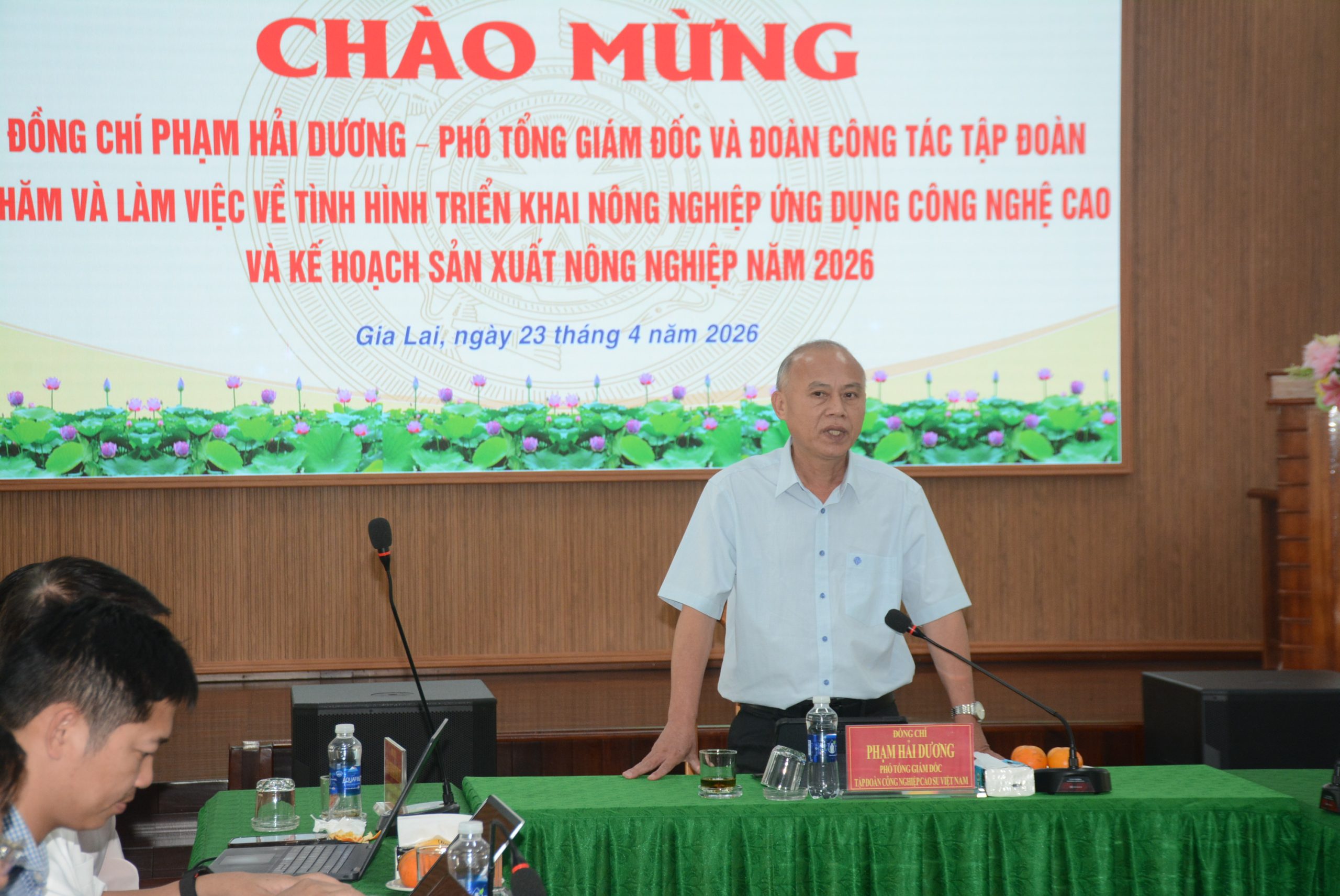 Tại buổi làm việc, đại diện lãnh đạo 3 đơn vị đã báo cáo lãnh đạo VRG và đoàn công tác về tình hình triển khai công tác nông nghiệp và tiến độ các dự án nông nghiệp ứng dụng công nghệ cao. Theo đó, về công tác nông nghiệp, năm 2026 Cao su Chư Sê được VRG giao khai thác 4.630 tấn; Cao su Chư Prông 7.500 tấn…sản lượng Cao su Chư Sê đã thực hiện được trong quý I/2026 đạt 11,5 %, tương đương 534 tấn. Công tác trang bị đầu mùa cạo, đến ngày 21/4 đã trang bị đầy đủ vật tư cho vườn cây.